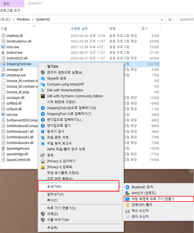 SnippingTool.exe 에 우클릭(Right Click) -> 보내기 -> 바탕 화면에 바로 가기 만들기